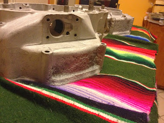The previous owner of my 38 motor decided to fill in the pock marks on the cases with some kind of aluminum filler. It looked like shit, no two ways about it. Some kind of putty that supposedly would polish out to look like aluminum. But it looked like shit. My buddy has access to a nice blasting cabinet at work and he said I could use it today so I took him up on it. They cleaned up nicely but Crater Face would be a fitting nickname for these case halves. It looks as if this motor sat buried in the dirt. I'm confident that all can be fixed with the almighty TIG. Here are some shots of the 75 year old cases all washed up after blasting.